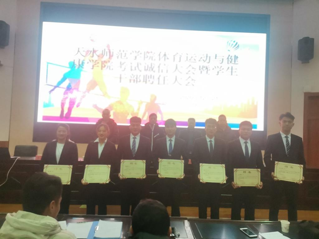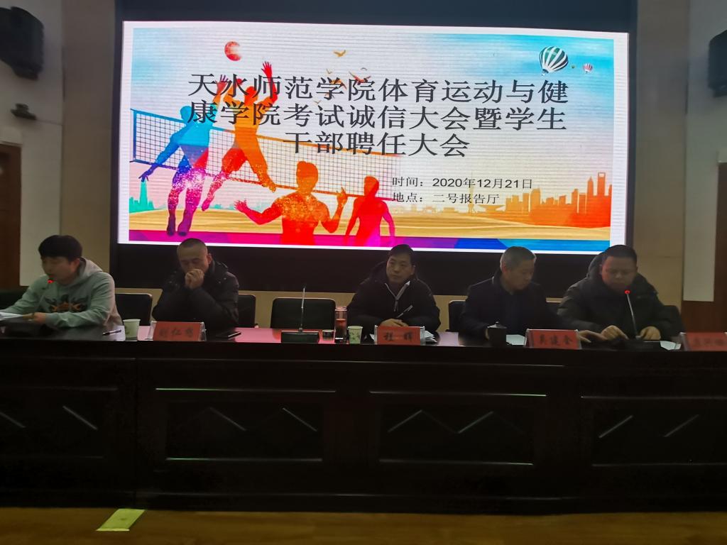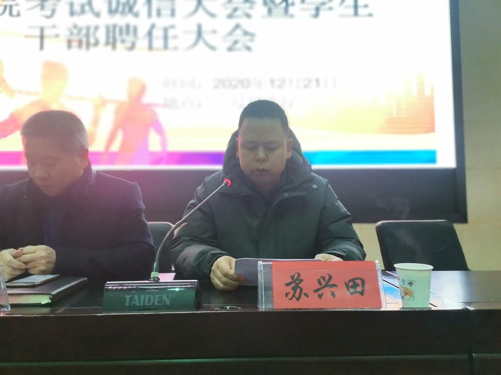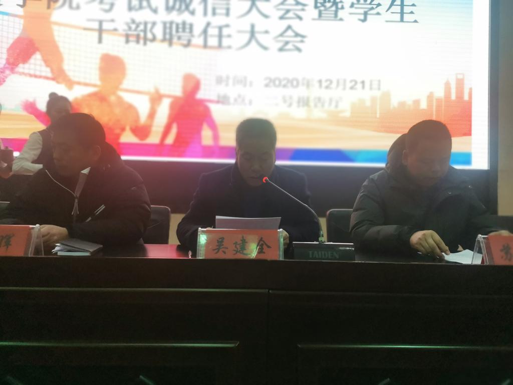 12月21日晚,2026世界杯预测在二号报告厅召开考试诚信教育大会暨员工干部聘任大会,公司党政领导班子,各教学系(部)主任,辅导员,19级、20级各班班主任,20级全体员工,以及19级、18级、17级各班员工代表共计370多人参加。大会由公司团委书记王昊支持。