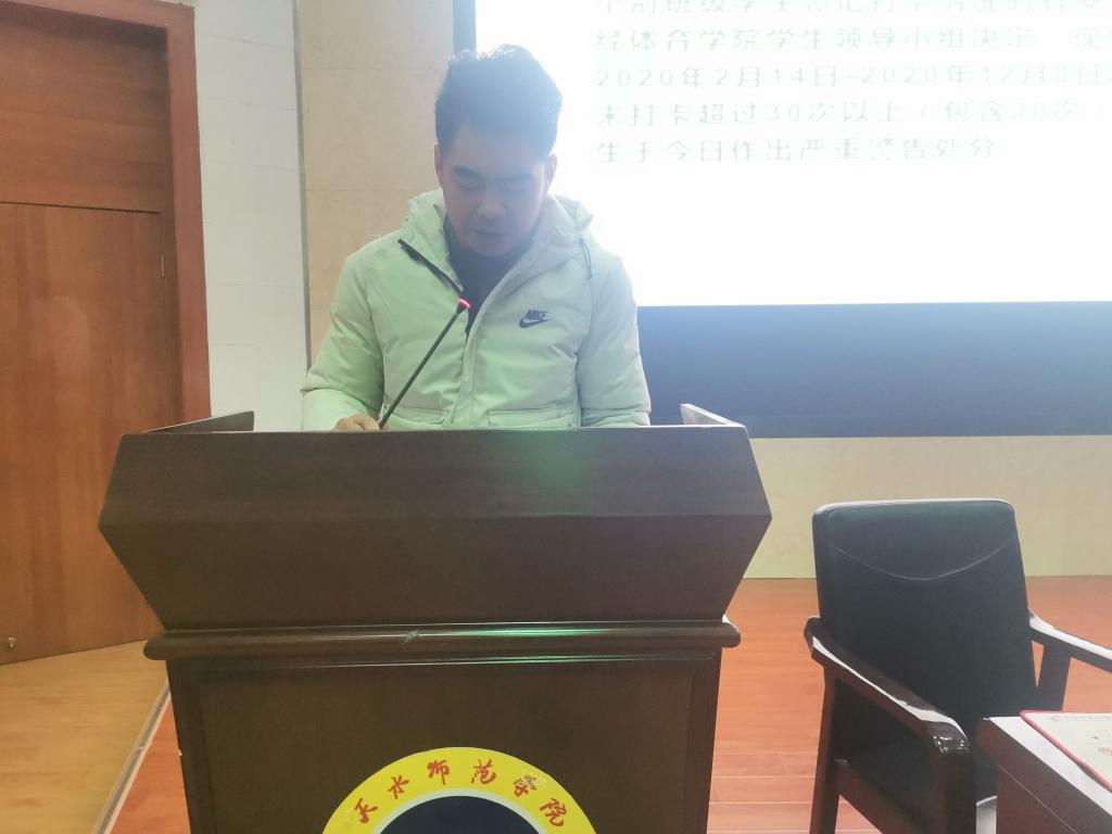 员工代表18级社体一班李佳明同学作考试诚信承诺发言,并倡导全体员工以诚信为本,立德修身,自觉严肃考风考纪,营造诚信、文明、积极、向上的考试氛围。